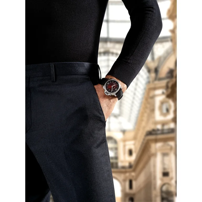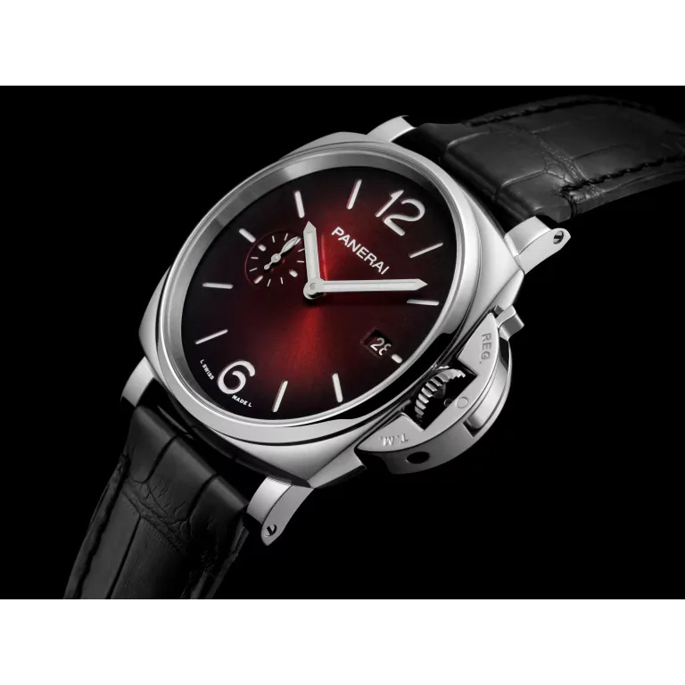 Burgundy sun-brushed with luminous Arabic numerals and hour markers. Date at 3 o’clock and small seconds at 9 o’clock.