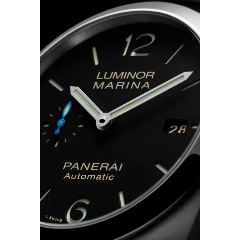 Black with luminous Arabic numerals and hour markers Date at 3 o’clock and small seconds at 9 o’clock.