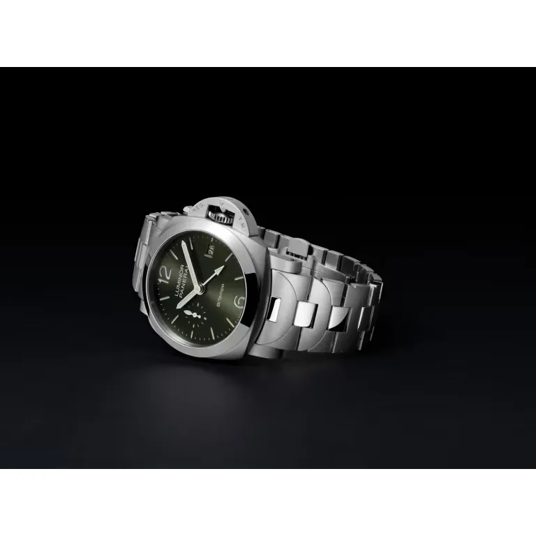 Green with luminous Arabic numerals and hour markers. Date at 3 o’clock and small seconds at 9 o’clock