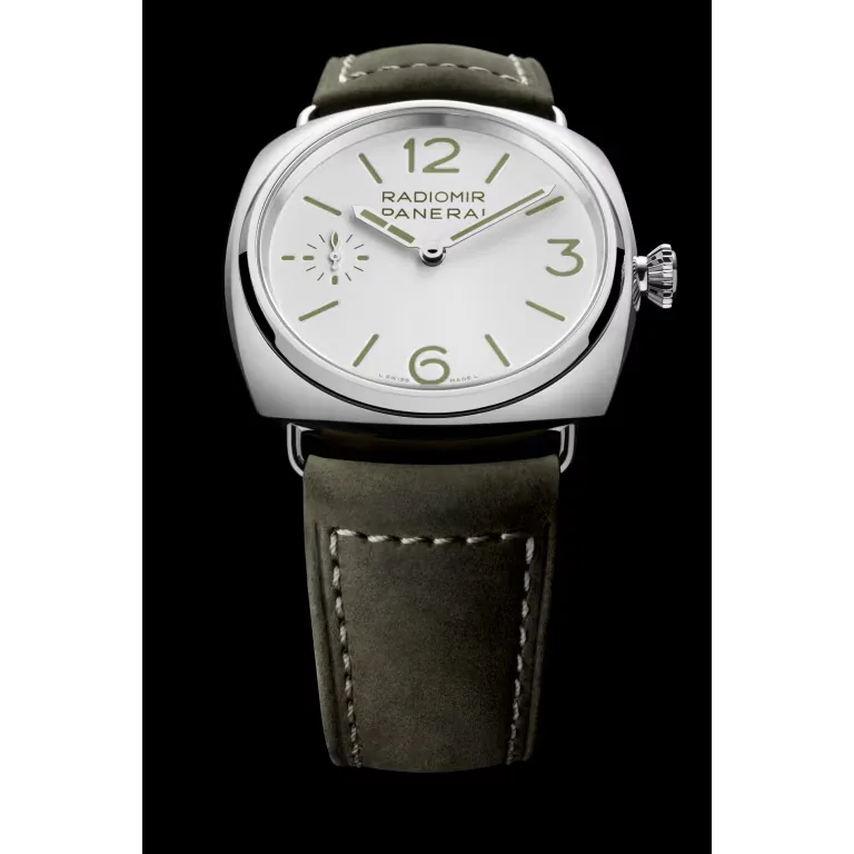 White grainy with luminous Arabic numerals and hour markers. with luminous Arabic numerals and hour markers. Small seconds at 9 o’clock.