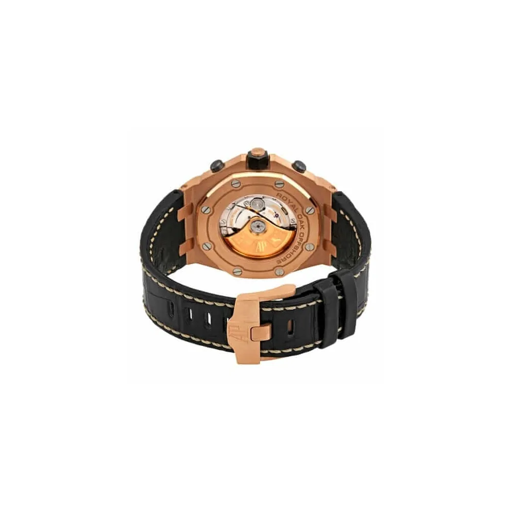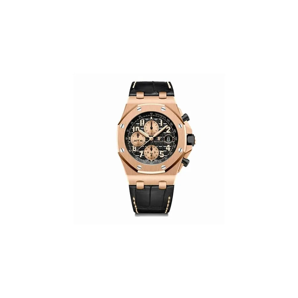The Audemars Piguet Royal Oak 26470OR.OO.A002CR.02 Chronograph Replica is a luxury watch. It features a ceramic rose gold case with a 904L stainless steel bezel in the same color. The sapphire crystal is 42.00 mm in size and 14.13 mm thick. The black leather strap is adjustable and features a 904L stainless steel AP pin buckle in rose gold. The black dial has stick and dot indices with Royal Oak hour-markers made of 904L stainless steel. The movement is an automatic AP 3126 with a power reserve of 60 hours and a precision of (-3/+3 sec/day) within COSC certification limits.