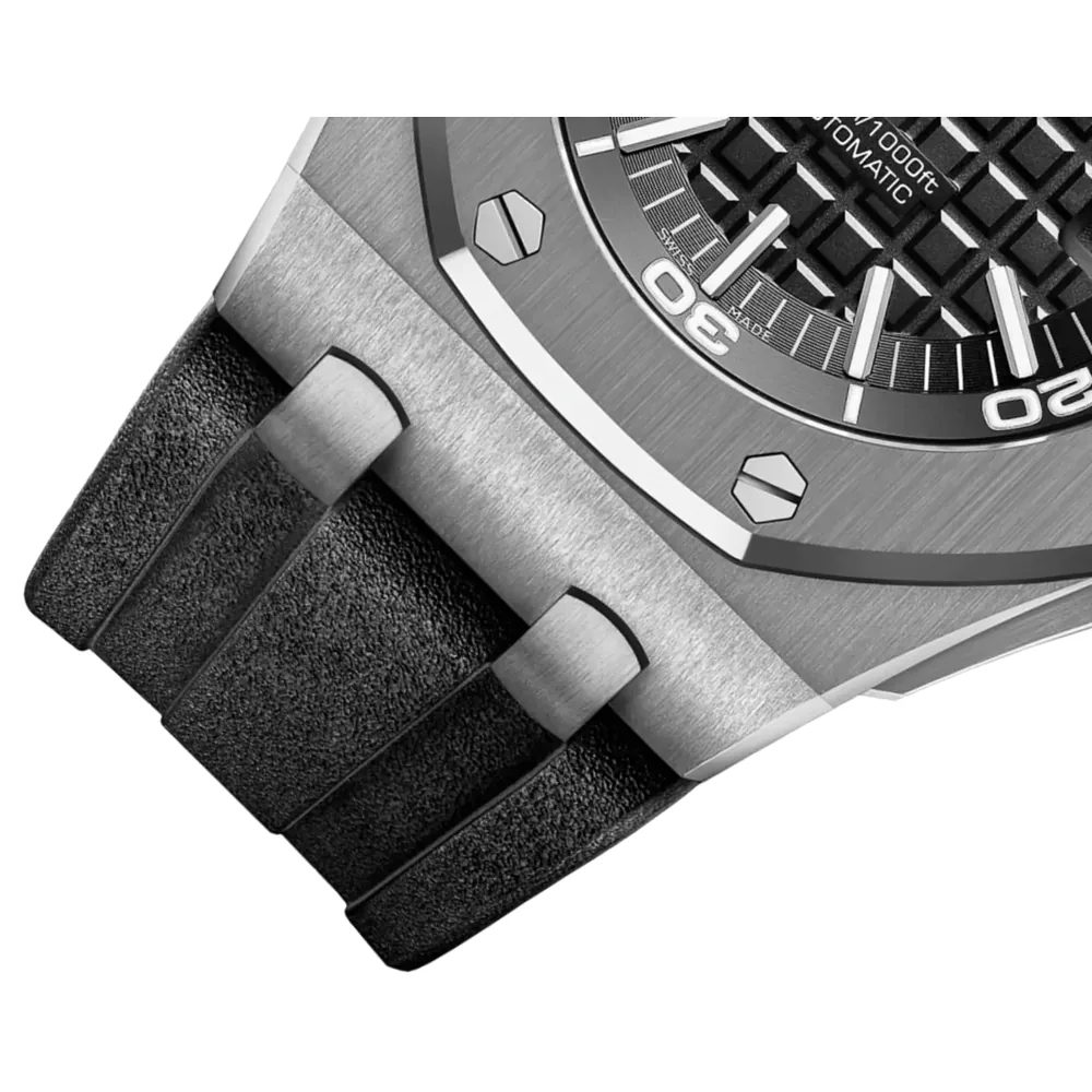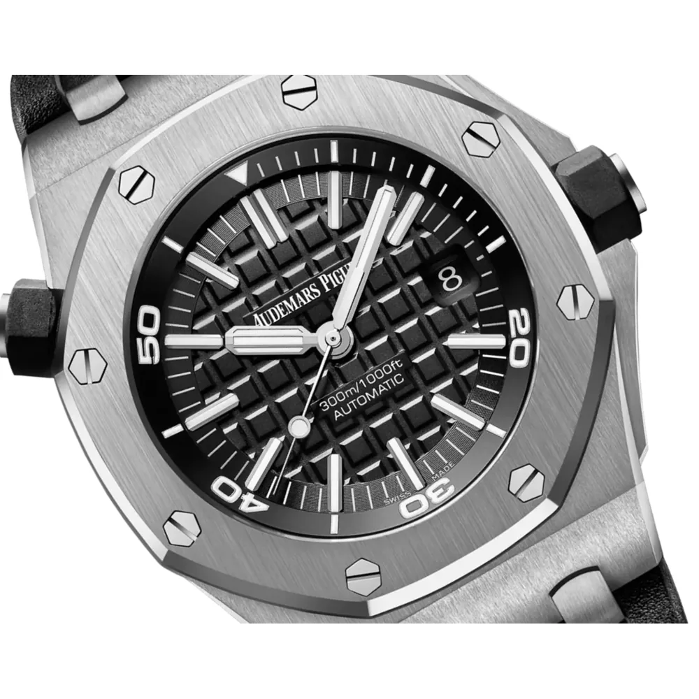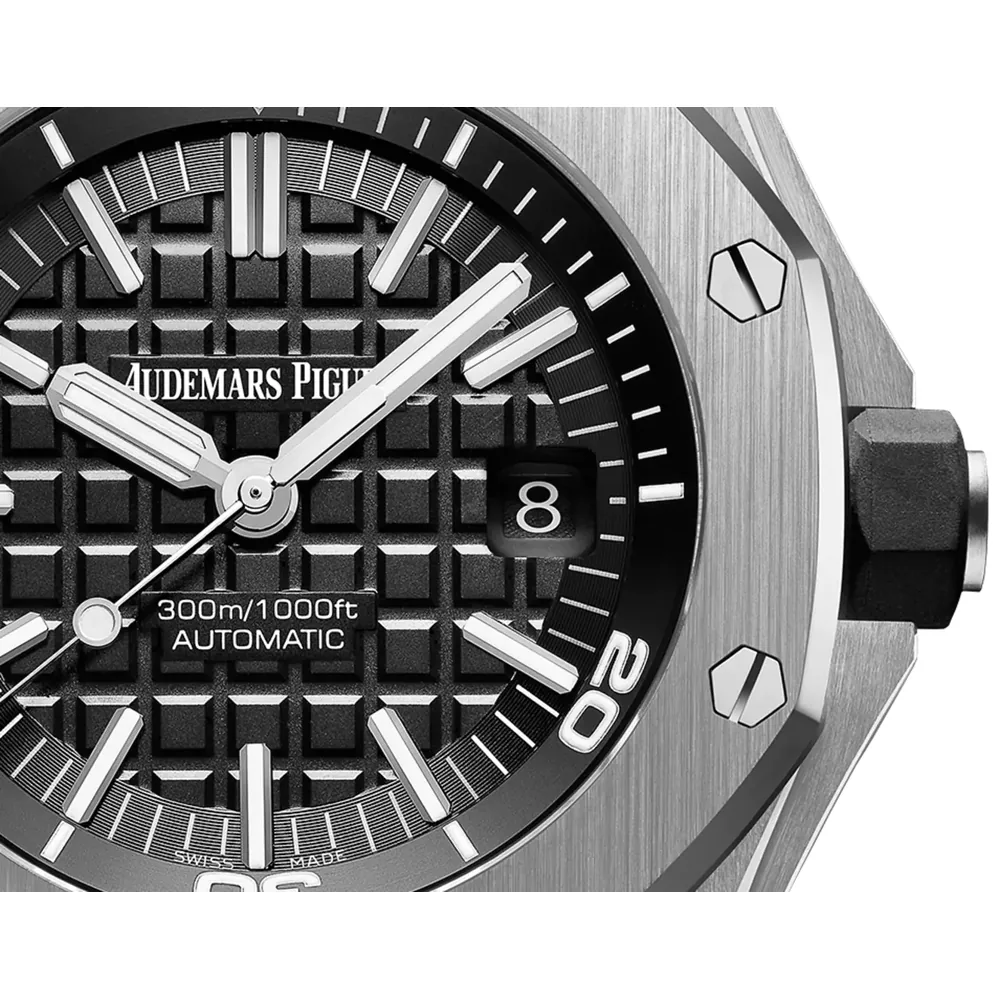 Black dial with “Méga Tapisserie” pattern, white gold applied hour-markers and Royal Oak hands with luminescent coating (black minutes hand), black or silver-toned rotating inner bezel with diving scale and zone from 60 to 15 minutes in black.
