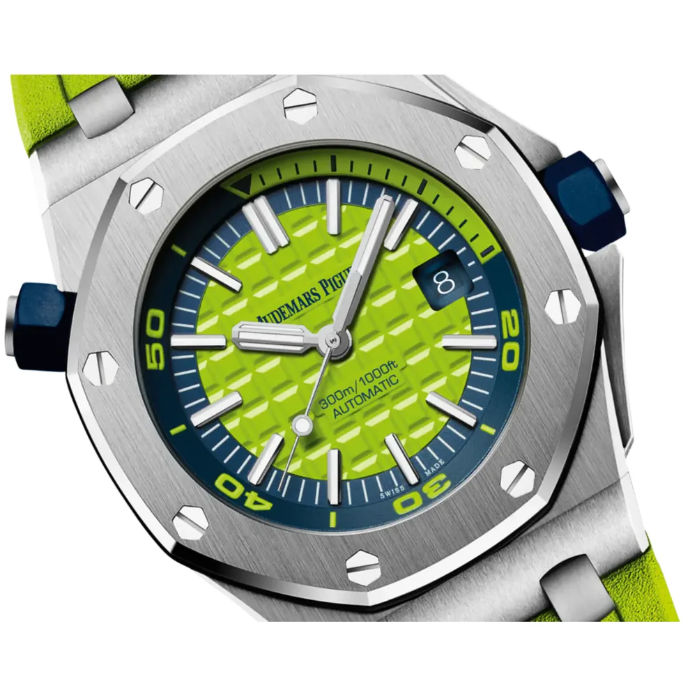 Green dial with “Méga Tapisserie” pattern, white gold applied hour-markers and Royal Oak hands with luminescent coating, blue rotating inner bezel with diving scale and zone from 60 to 15 minutes in yellow green.
