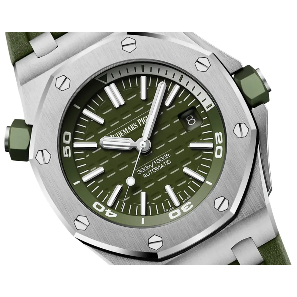 Khaki dial with “Méga Tapisserie” pattern, white gold applied hour-markers and Royal Oak hands with luminescent coating, khaki rotating inner bezel with zone from 60 to 15 minutes in white.