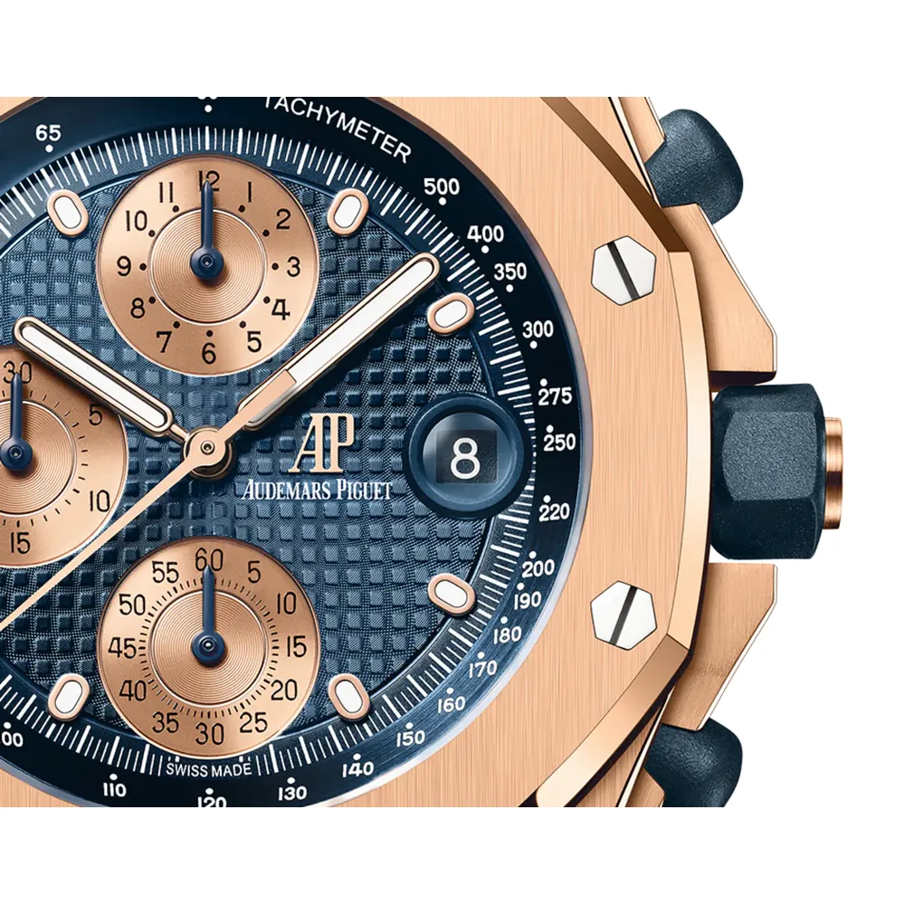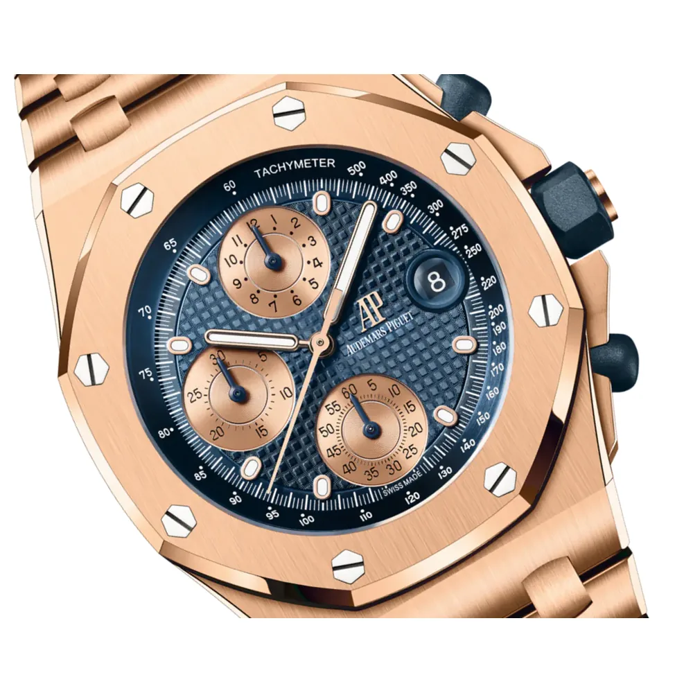 Blue dial with “Petite Tapisserie” pattern, pink gold-toned counters, pink gold applied hour-markers and Royal Oak hands with luminescent coating, blue inner bezel.
