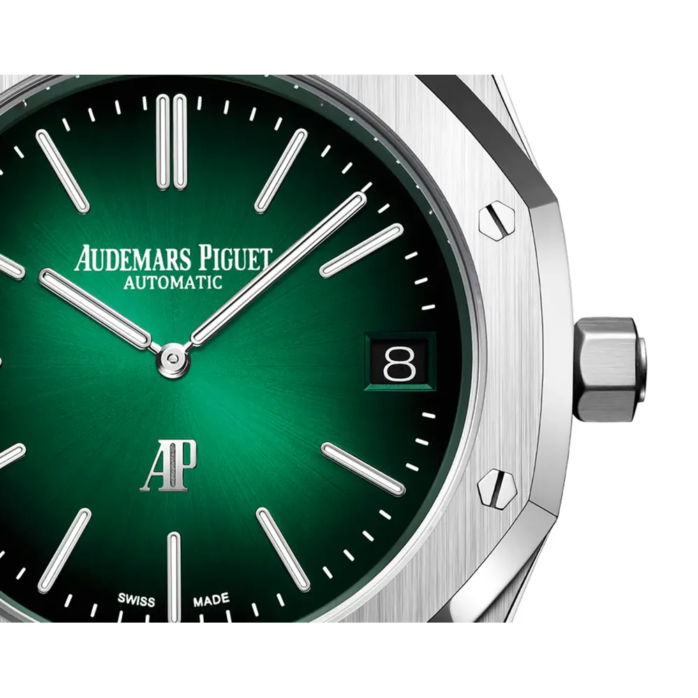 Smoked green dial with sunray pattern base, white gold applied hour-markers and Royal Oak hands with luminescent coating