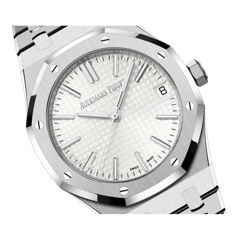 Silver-toned dial with “Grande Tapisserie” pattern, white gold applied hour-markers and Royal Oak hands with luminescent coating.