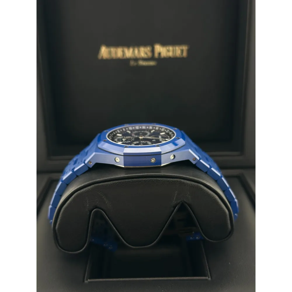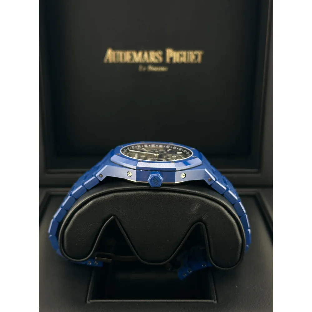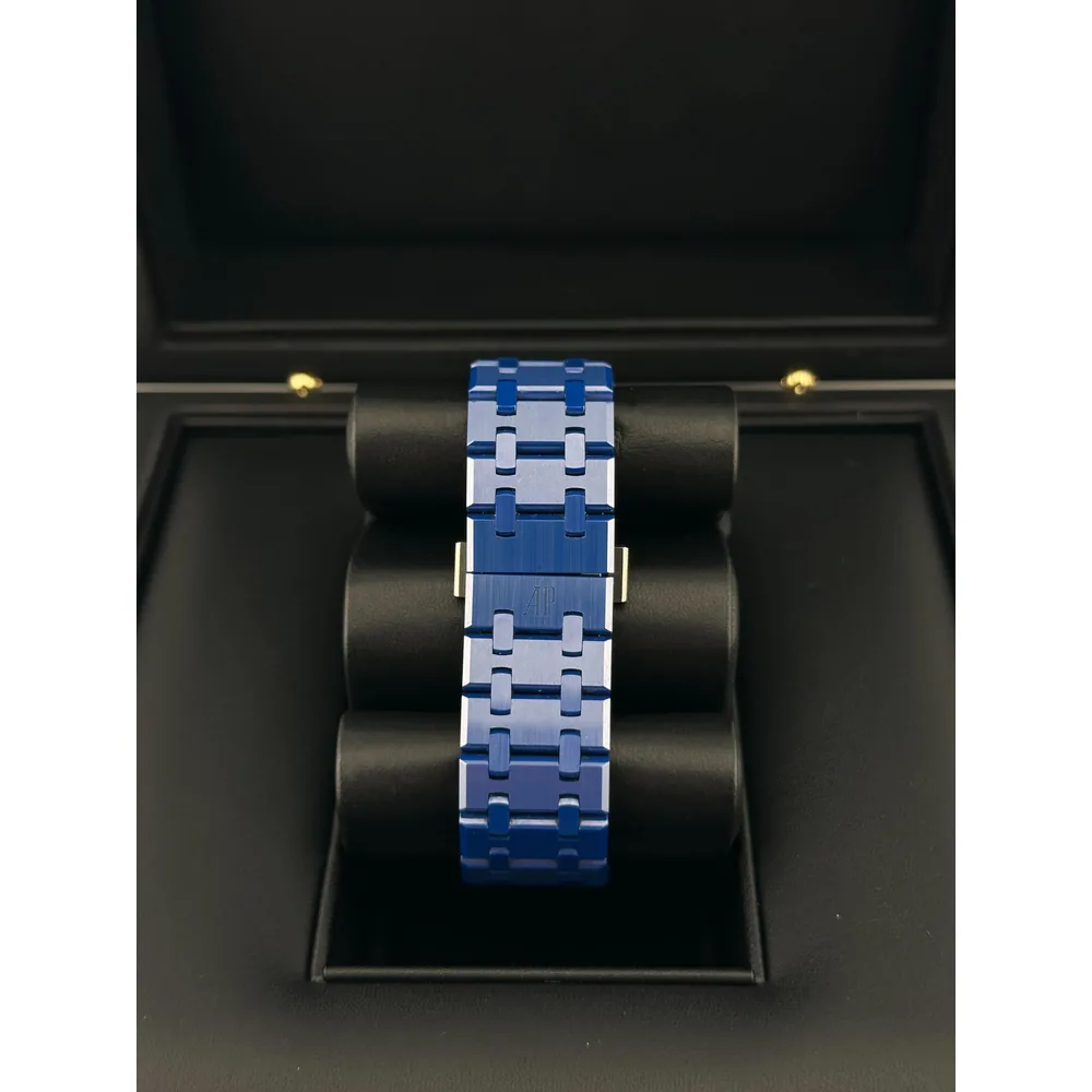 Encased in blue ceramic, the watch not only exudes elegance but also boasts a water resistance of 20 meters, making it suitable for daily wear. The matching blue ceramic bracelet, featuring an AP folding clasp in blackened polished steel, provides both comfort and style.