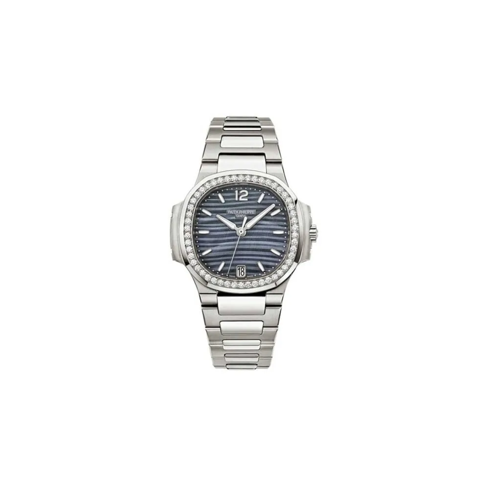 Patek Philippe Nautilus Blue Tinted Mother Of Pearl Dial Automatic Ladies Diamond Watch 7018/1A-010. Stainless steel case with a stainless steel bracelet. Fixed bezel. Blue tinted mother of pearl dial with silver-tone hands and index- Arabic at the 12 o’ clock hour markers. Dial Type: Analog. Luminescent hands and markers. Date display at the 6 o’clock position. Automatic movement. Caliber 324 s c engine. Scratch resistant sapphire crystal. Skeleton transparent exhibition see through case back. Case diameter: 33.6 mm. Cushion case shape. Fold over with safety clasp. Water resistant at 60 meters / 200 feet. Functions: date, hour, minute, second. Additional Info: bezel set with 50 diamonds (~0.71 ct). Luxury watch style.