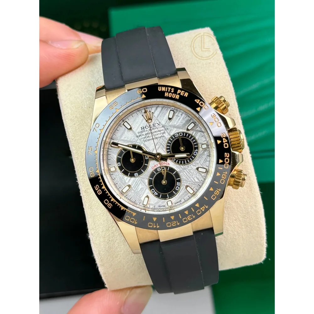 This model is the only Cosmograph Daytona with a meteorite dial. Meteorite comes from the heart of an asteroid or possibly even a planet that has exploded, propelling material across the Solar System until chance brings it into our planet’s orbit and gravity pulls it to Earth. During its journey, the centre of the meteorite is gradually transformed, producing highly unusual metallic patterns, resulting from the very slow cooling of molten asteroid cores. The designers at Rolex create from these configurations a unique treasure for some of the most prestigious models, including this Cosmograph Daytona.