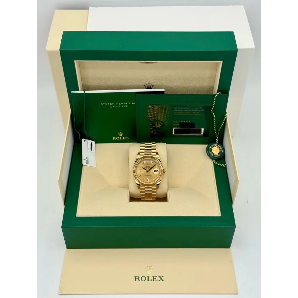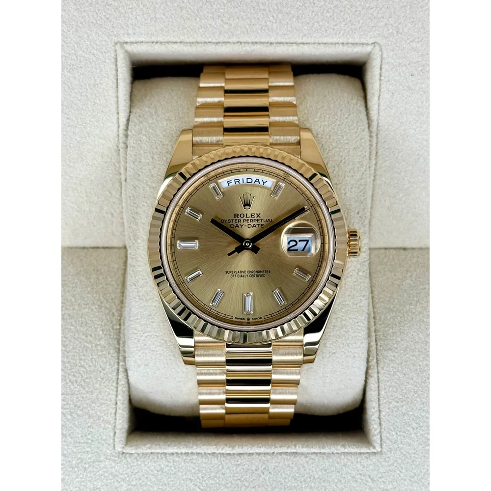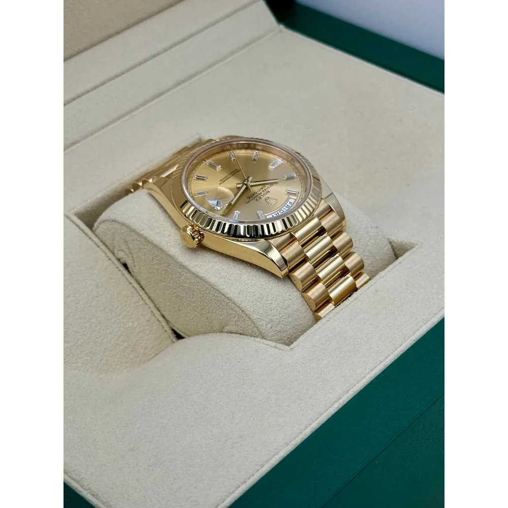 RLX Day-Date “President” 40mm Yellow Gold Champagne Diamond Baguette Dial – 228238