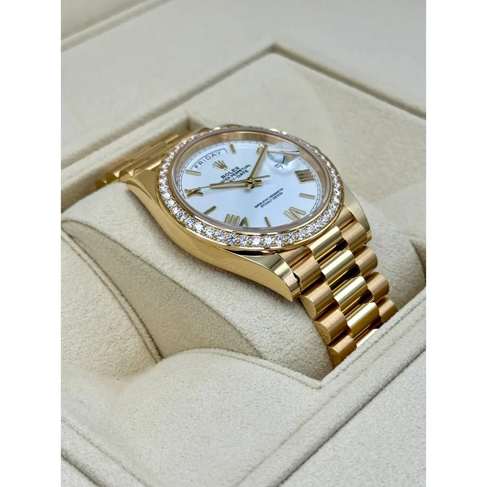 RLX Day-Date “President” 40mm Yellow Gold White Roman Dial Diamond Bezel – 228348rbr