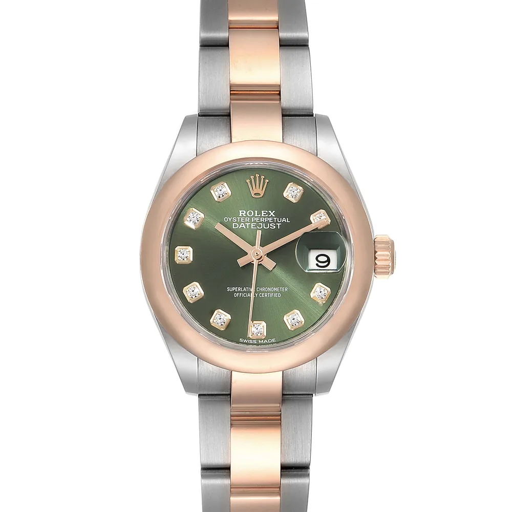 Rolex Perpetual Lady-Datejust Watch of Stainless Steel and 18k Everose Gold. Olive green dial set with diamonds hour markers. The domed 18k Everose Gold bezel. The Stainless Steel and 18k Everose Gold Oyster bracelet, 279161.