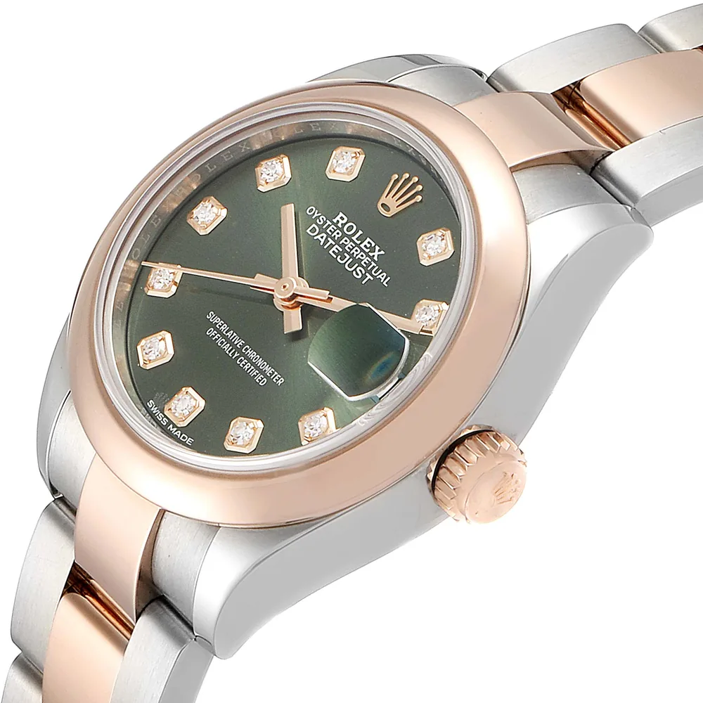 Rolex Perpetual Lady-Datejust Watch of Stainless Steel and 18k Everose Gold. Olive green dial set with diamonds hour markers. The domed 18k Everose Gold bezel. The Stainless Steel and 18k Everose Gold Oyster bracelet, 279161.