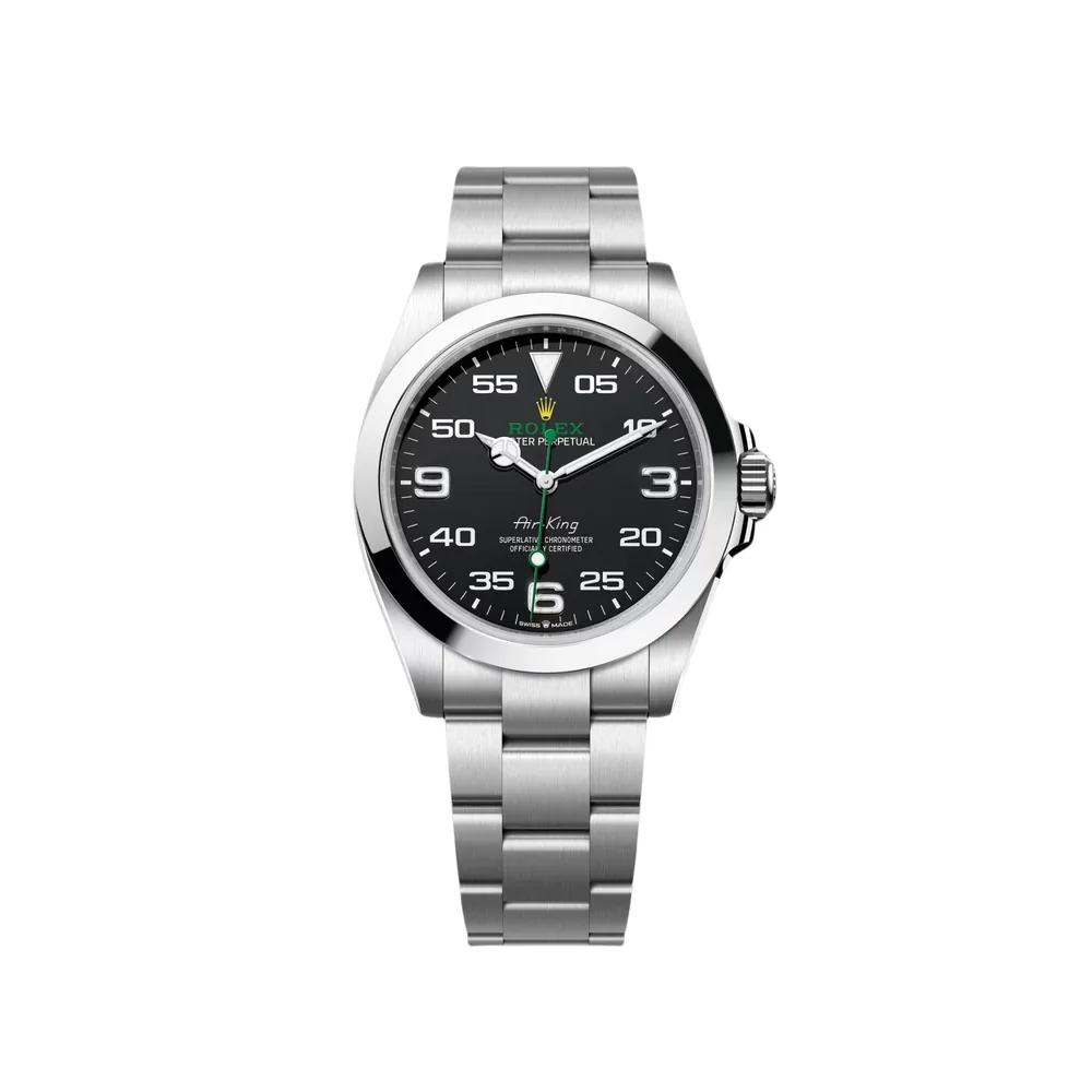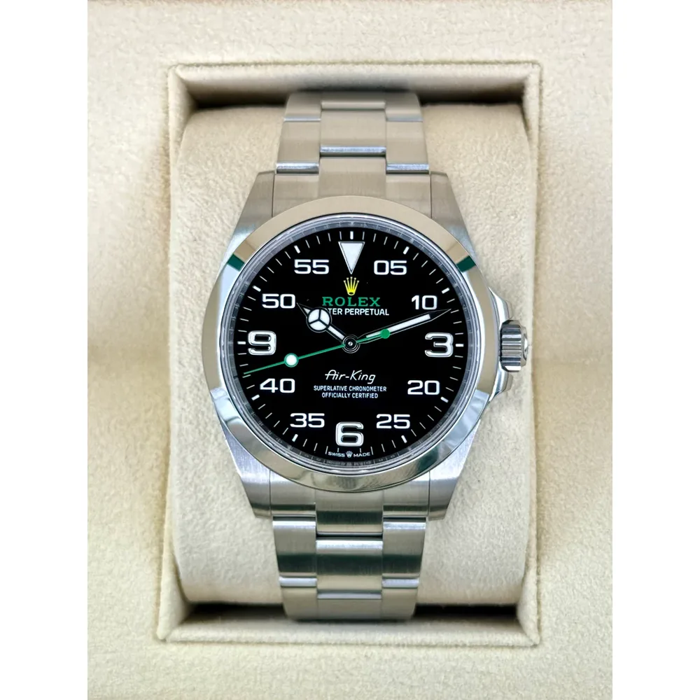 Rolex Oyster Perpetual Air King Black Dial Steel Mens Watch 126900 Box Card. Officially certified chronometer automatic self-winding movement. Stainless steel oyster case 40.0 mm in diameter. Rolex logo on the crown. Stainless steel smooth domed bezel. Scratch resistant sapphire crystal. Black dial with luminescent Arabic numerals at every five minute mark and white gold Arabic numeral hour marker at 3, 6, and 9 o’clock. Luminescent Mercedes hands. Green luminescent lollipop-tipped seconds hand. Stainles steel oyster bracelet with a flip-lock clasp. Fits a 7 3/4″ wrist.